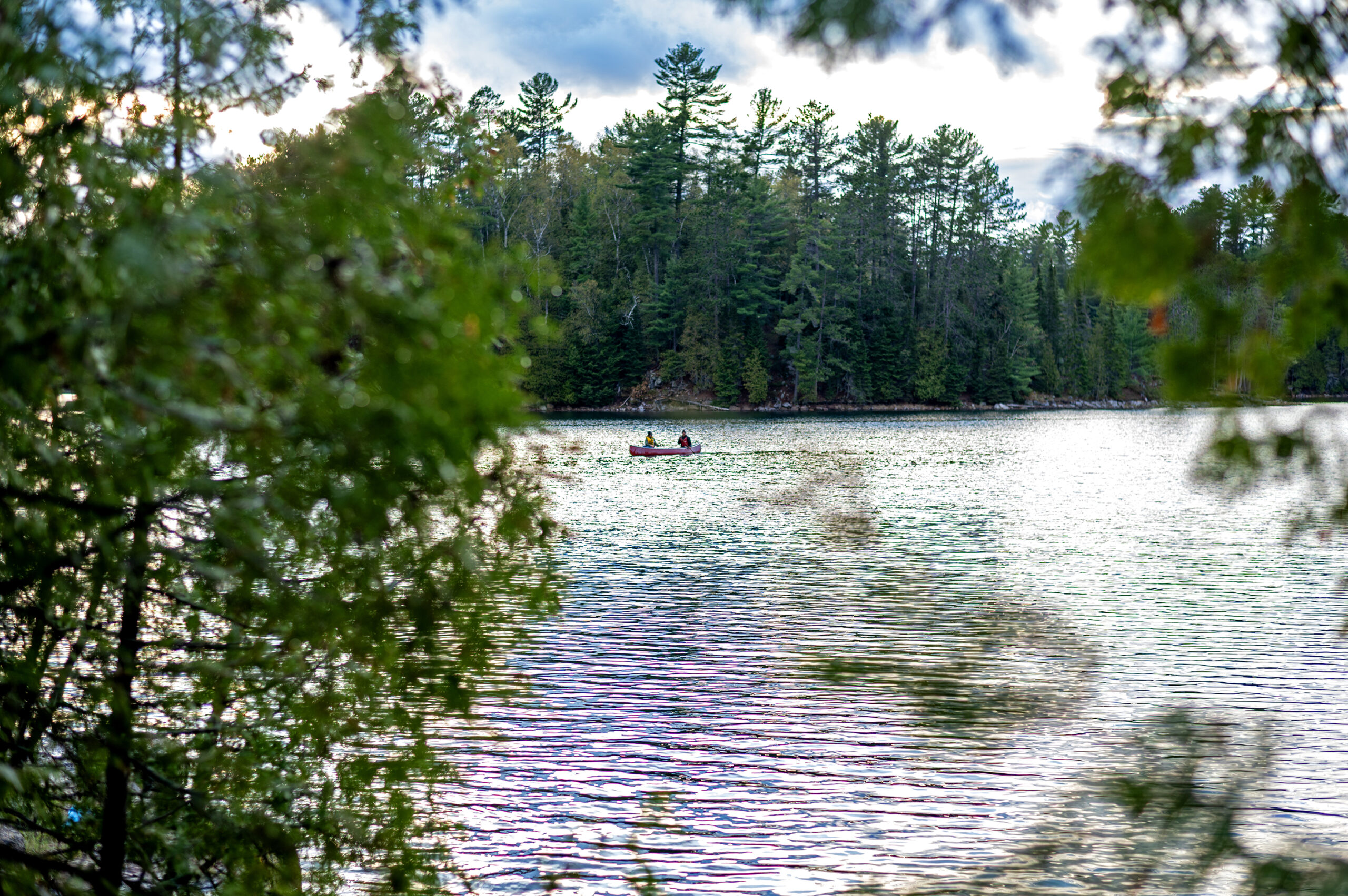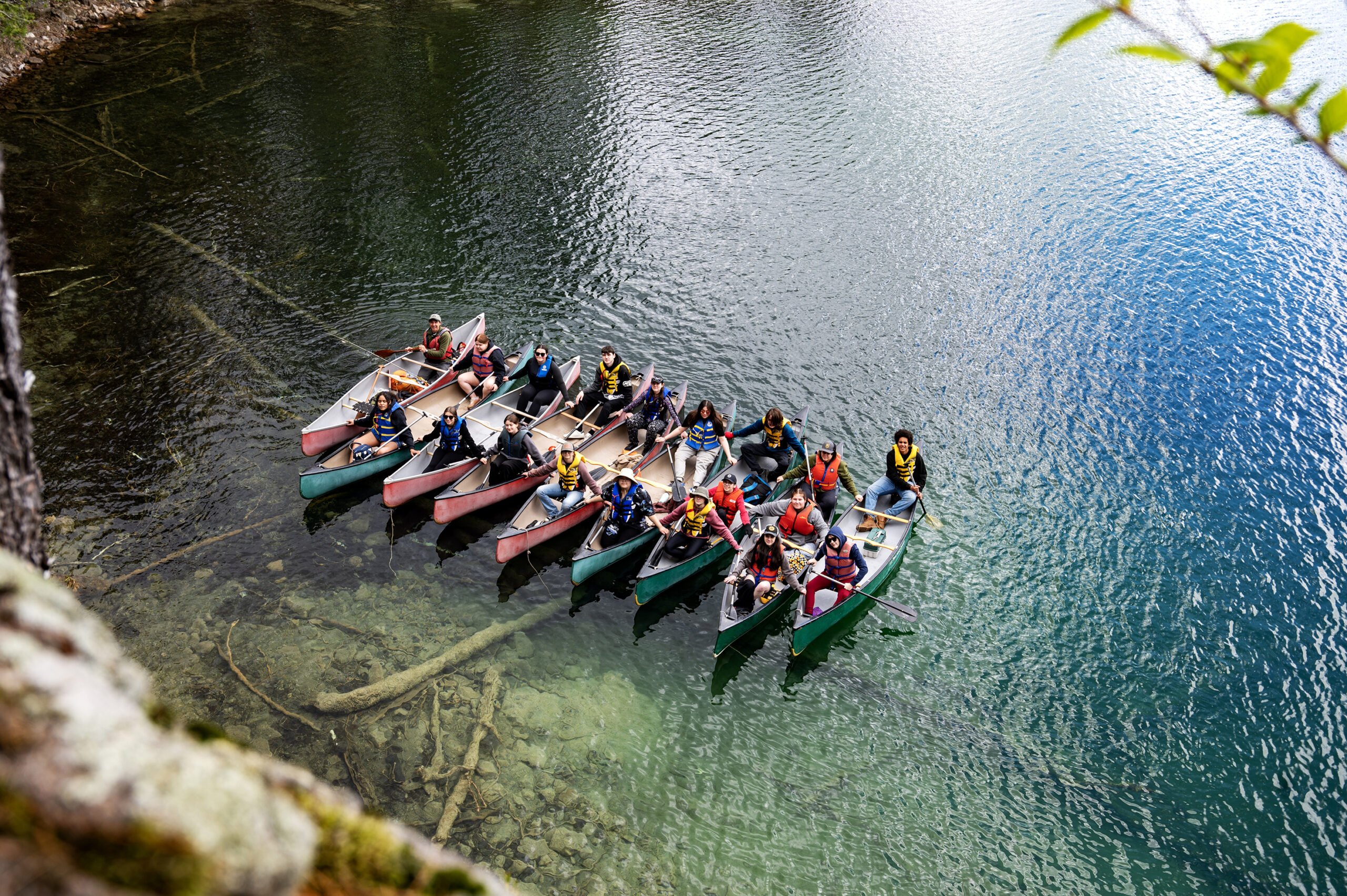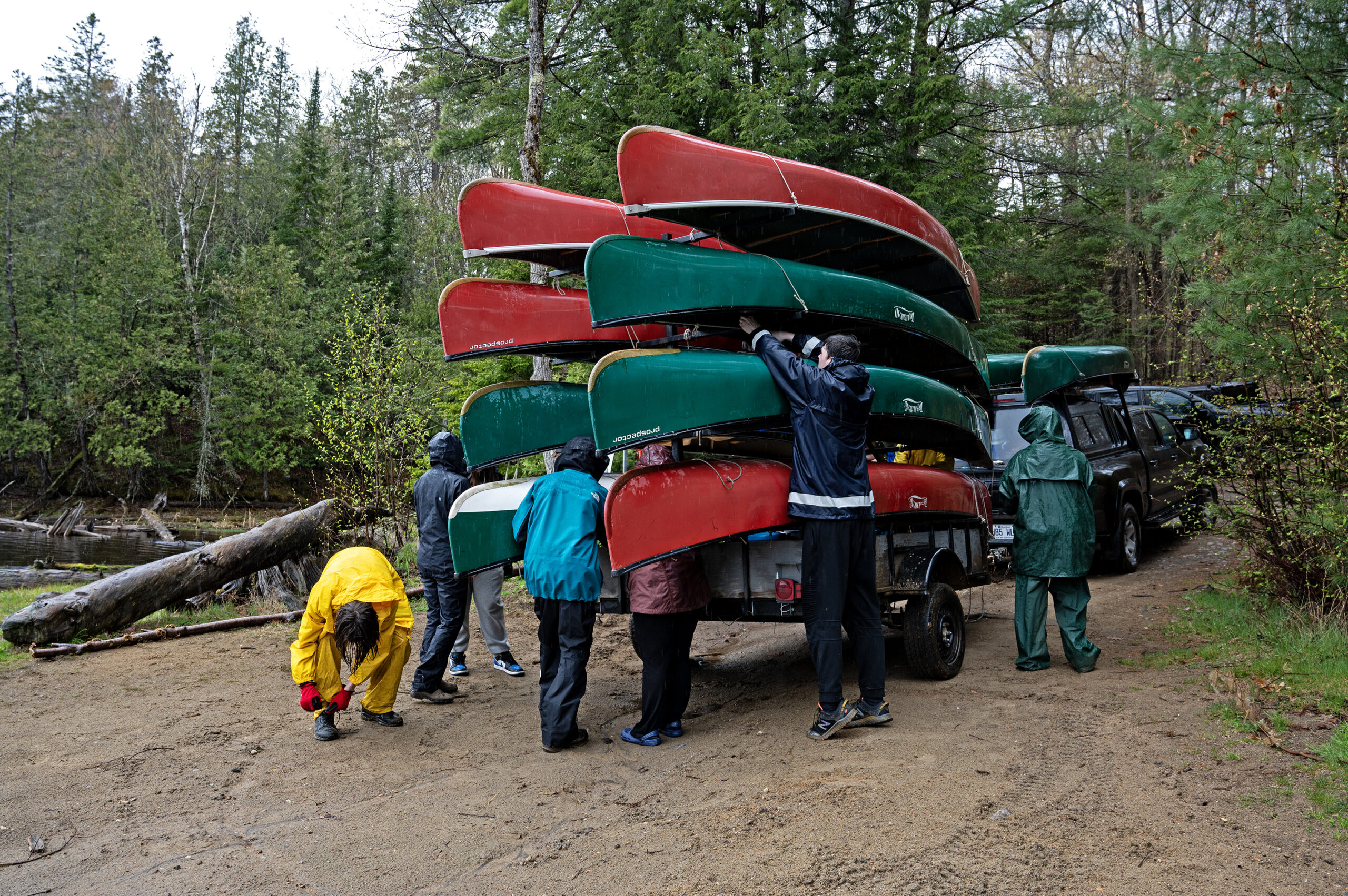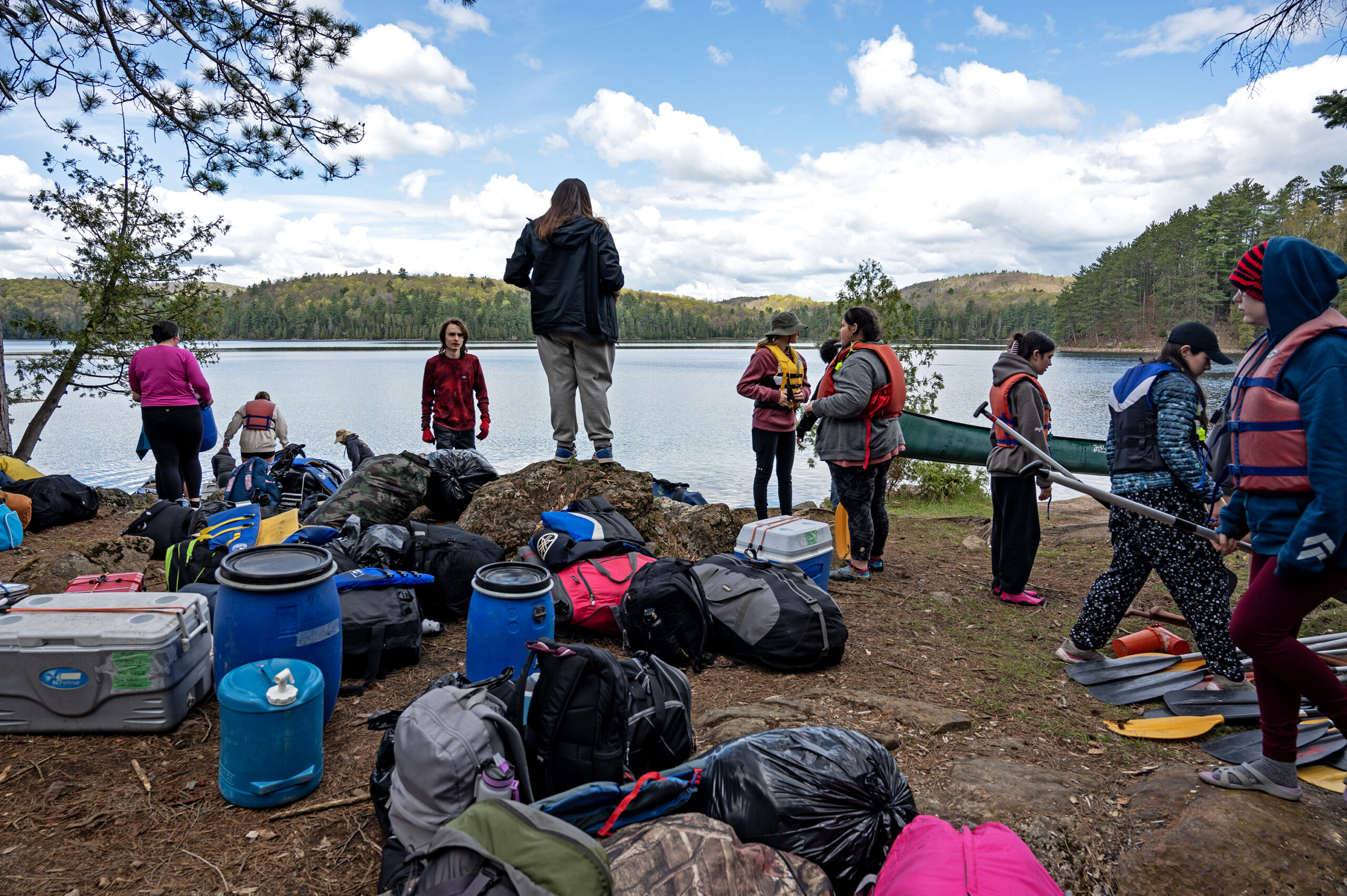 Day 1 was off to a rainy start, but spirits were high. After an initial team meeting, students got to work immediately, helping to unload the canoes, transferring food into proper storage bins, and evenly loading the canoes. The two-hour canoe paddle to the island where they would be setting up camp on the pristine Green Lake went smoothly despite the rain.
