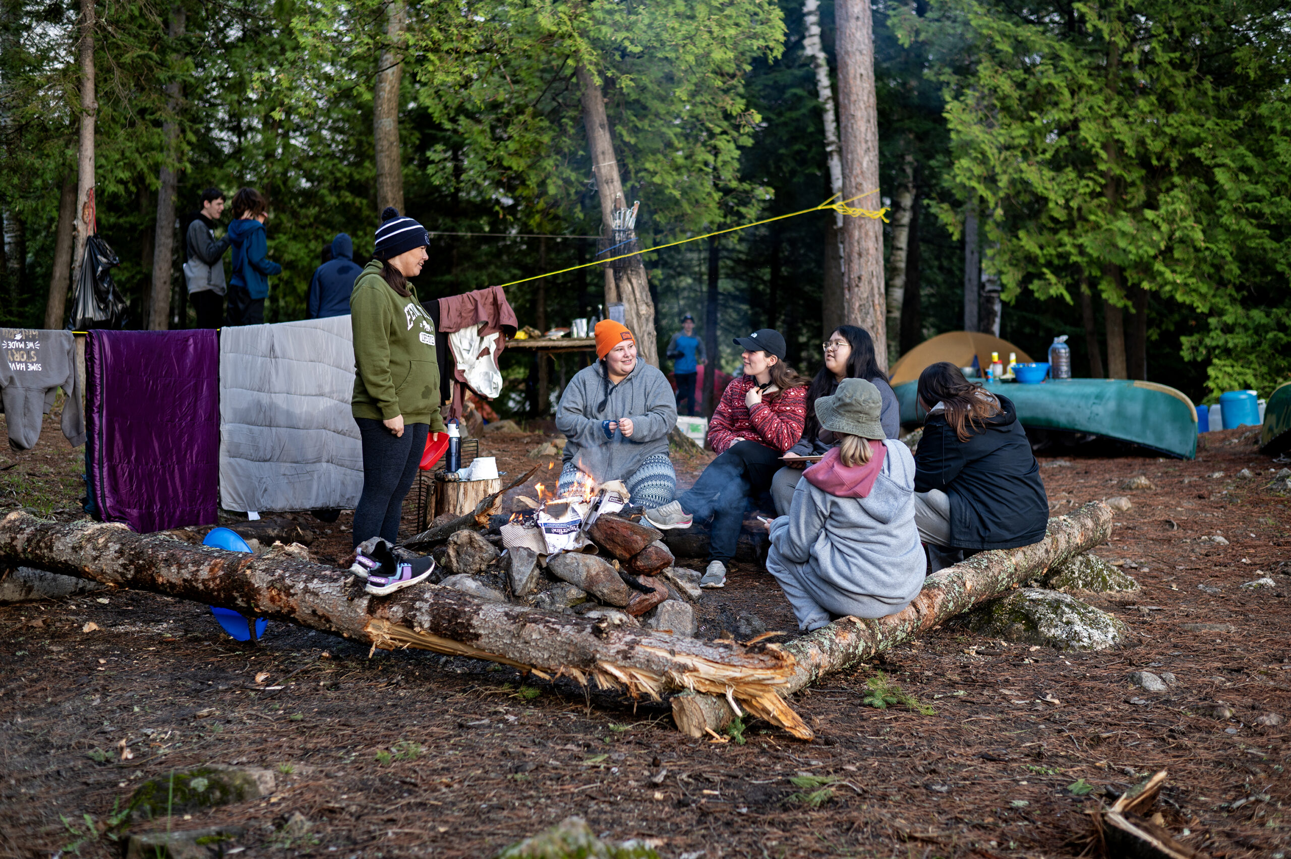 Upon arrival the students and teachers worked together to set up their tents and the main camp. A fire was started, and the rain eventually (thankfully) stopped. Ms. Ahern-Davy proceeded to divide students into their teams for cooking and cleaning duties. For many students, the trip also served as a crash course for how to make a meal! They used two flipped canoes as food prep tables, and Mr. E provided all the cooking and cleaning supplies.
