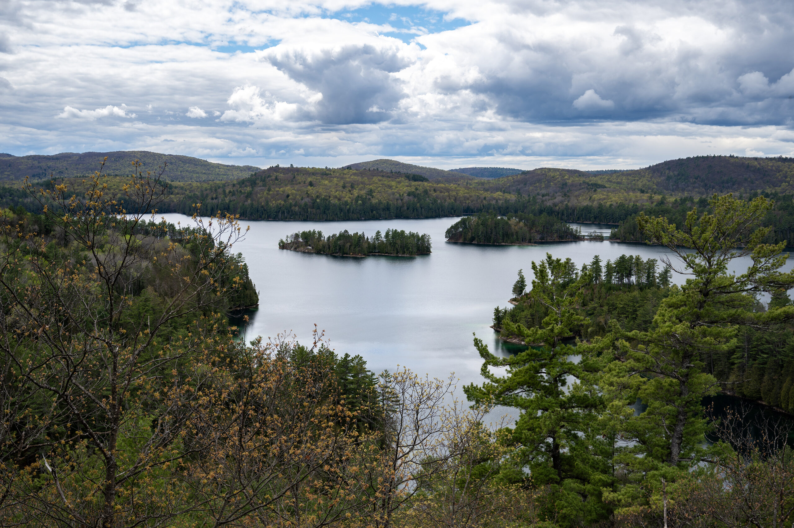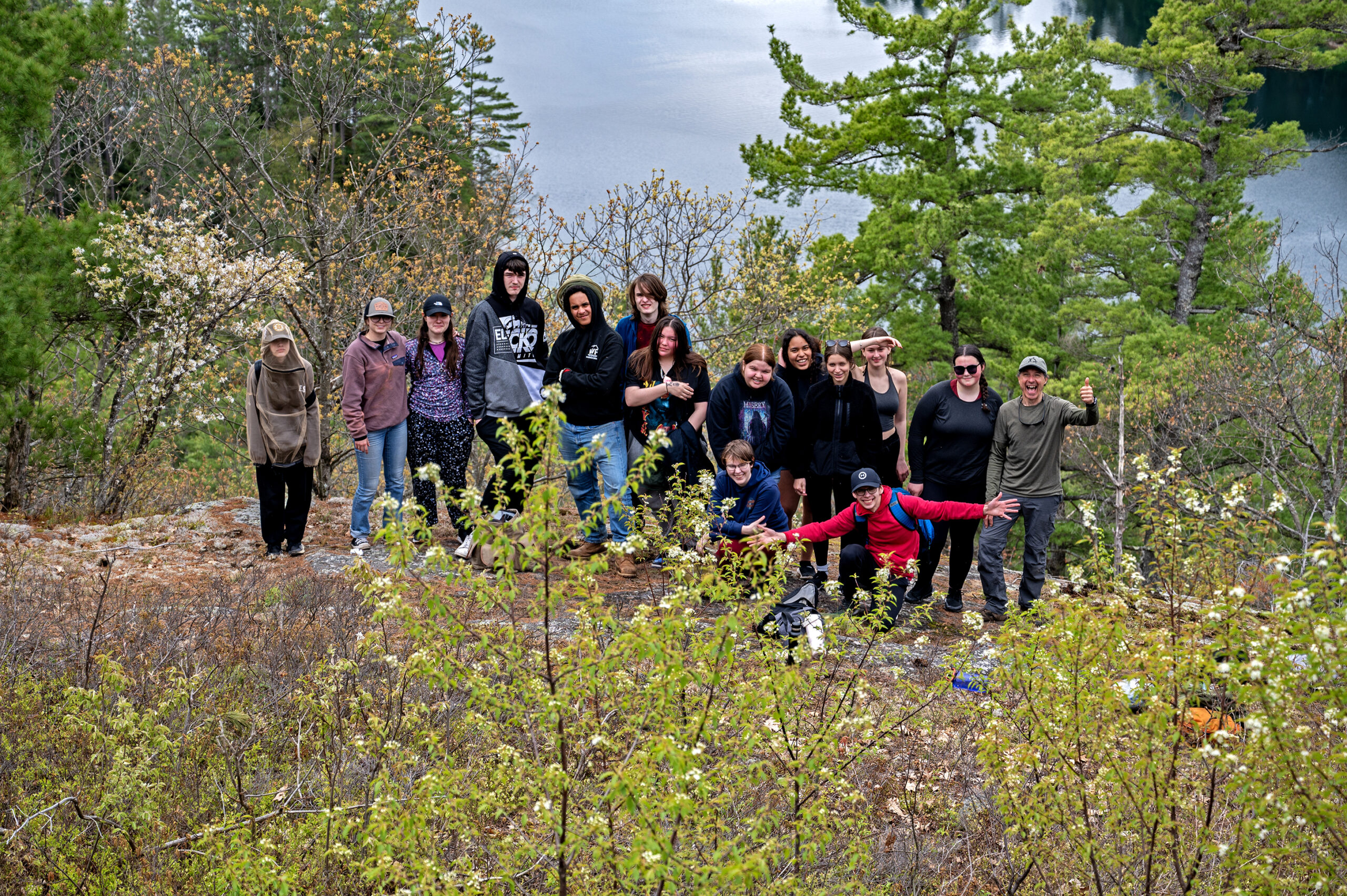 Day 2 was off to a dry and warmer start. After breakfast and lunch prep, the students paddled to the highest mountain in the area and hiked to the top. Students ate their well-earned lunch at the summit, enjoying the stunning view, which included the island on which they were camping.