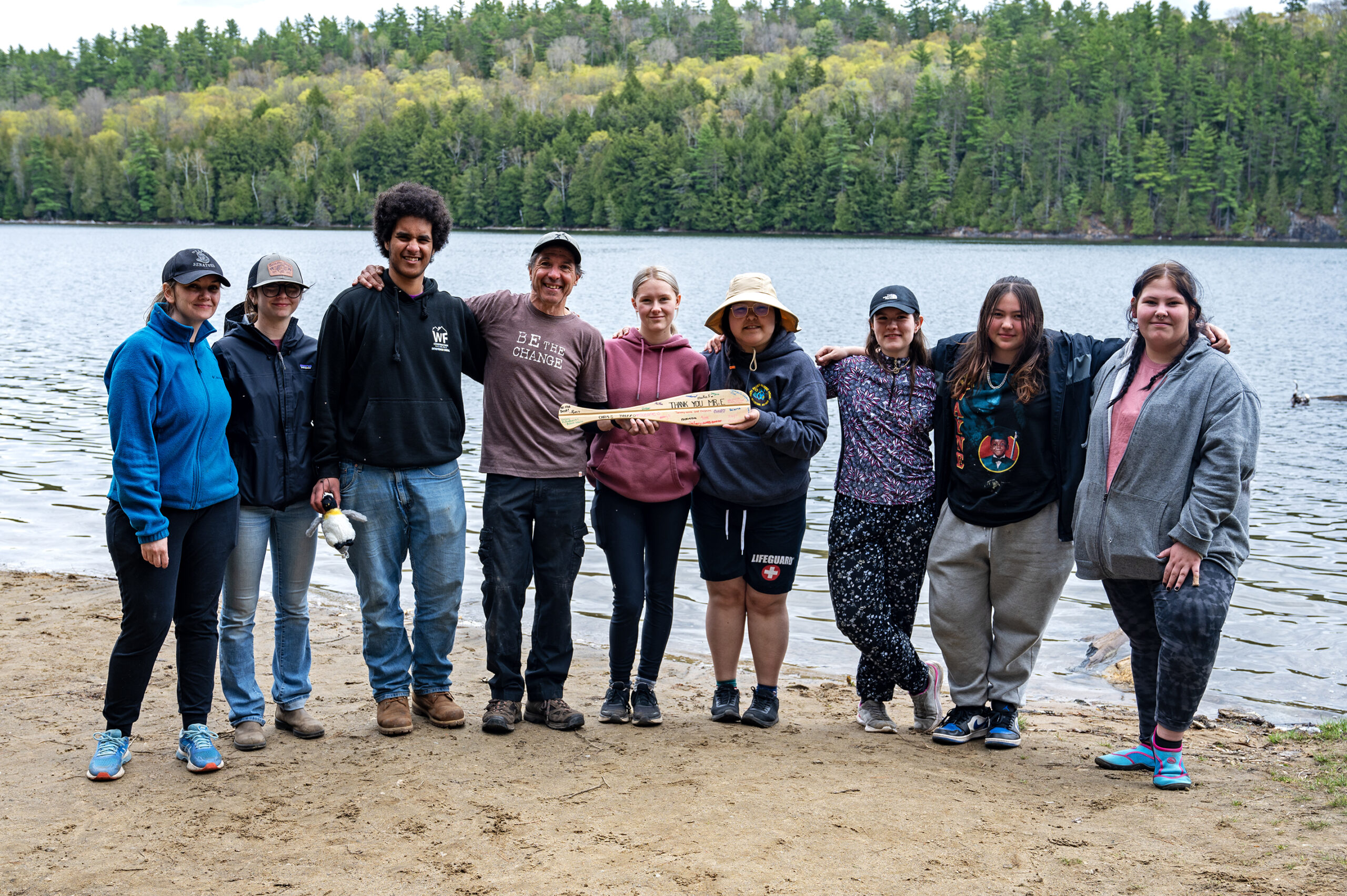 The canoe trip back was fast and smooth. Close to the end of the journey, the group stopped and rafted together for one last meal together. “Rafting” is positioning all canoes side by side and having all paddlers hold on to the canoes on either side. During this time everyone was invited to share one of their favourite parts of the trip. Afterward, Ms. Ahern-Davy presented Mr. Earwaker with a touching gift, a little canoe paddle. On one side all the students and teachers on the trip had signed it, wishing Alan a wonderful retirement. On the other side, a talented student had painted a beautiful loon on the water. The moment was bittersweet, and tears were shed by many. The gratitude for his service as an educator was keenly felt.