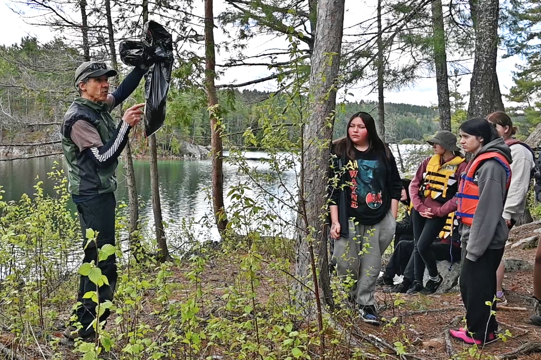 Planning for a three-day canoe camping trip is a huge undertaking for both Mr. E and for the lead Maniwaki Woodland teacher on the trip, Elise Ahern-Davy, who had been working on the trip’s logistics from the school’s end since Fall 2023. Preparations included meal planning, shopping, and prepping, creating student teams, as well as ensuring students were prepared, communicating with and updating Mr. Earwaker on numbers and supplies needed, finding parent volunteers with 4-wheel drive vehicles to help drive supplies to and from the canoe loading zone, among many other planning considerations. Also present for support was Maniwaki Woodland teacher and the WQSB’s new Indigenous Education Consultant, Drew Wapachee McDougall.