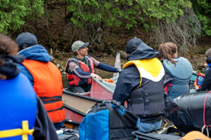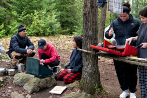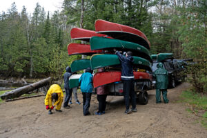 Planning for a three-day canoe camping trip is a huge undertaking for both Mr. E and for the lead Maniwaki Woodland teacher on the trip, Elise Ahern-Davy, who had been working on the trip’s logistics from the school’s end since Fall 2023. Preparations included meal planning, shopping, and prepping, creating student teams, as well as ensuring students were prepared, communicating with and updating Mr. Earwaker on numbers and supplies needed, finding parent volunteers with 4-wheel drive vehicles to help drive supplies to and from the canoe loading zone, among many other planning considerations. Also present for support was Maniwaki Woodland teacher and the WQSB’s new Indigenous Education Consultant, Drew Wapachee McDougall.