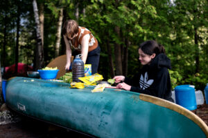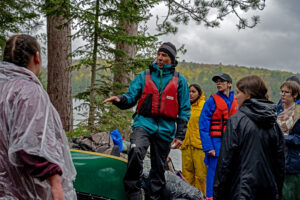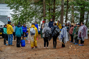 Day 1 was off to a rainy start, but spirits were high. After an initial team meeting, students got to work immediately, helping to unload the canoes, transferring food into proper storage bins, and evenly loading the canoes. The two-hour canoe paddle to the island where they would be setting up camp on the pristine Green Lake went smoothly despite the rain.
