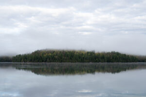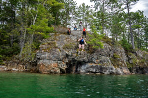 Day 2 was off to a dry and warmer start. After breakfast and lunch prep, the students paddled to the highest mountain in the area and hiked to the top. Students ate their well-earned lunch at the summit, enjoying the stunning view, which included the island on which they were camping.